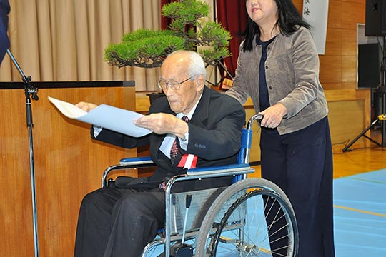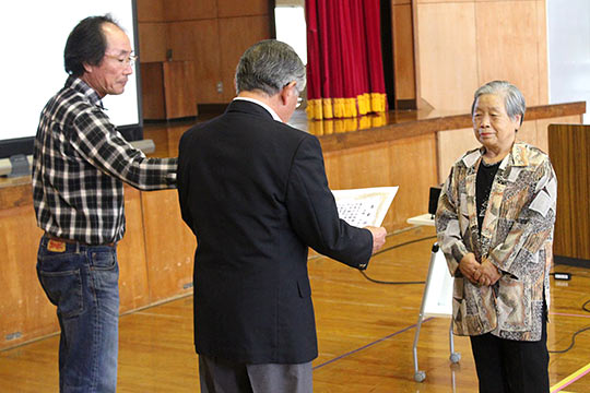 運動場でグラウンドゴルフ、体育館でゲームが行われた後、表彰式が行われ、グラウンドゴルフでの成績優秀者、ひとり金婚式に該当する方、今年誕生されたお子さんが表彰され、みなさんで温かく祝福しました。