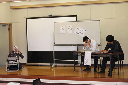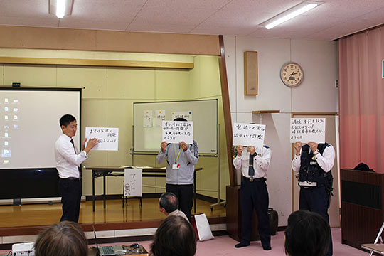 寸劇は新川駐在所の丸尾さん、大石駐在所の桶田さん、竹野駐在所(田主丸町)の松本さん、社協職員の4名で行い、福岡県内のニセ電話詐欺の被害件数・被害額の情報を交えつつ、ユーモアに溢れた内容で、会場は朗らかな笑いに包まれていました。